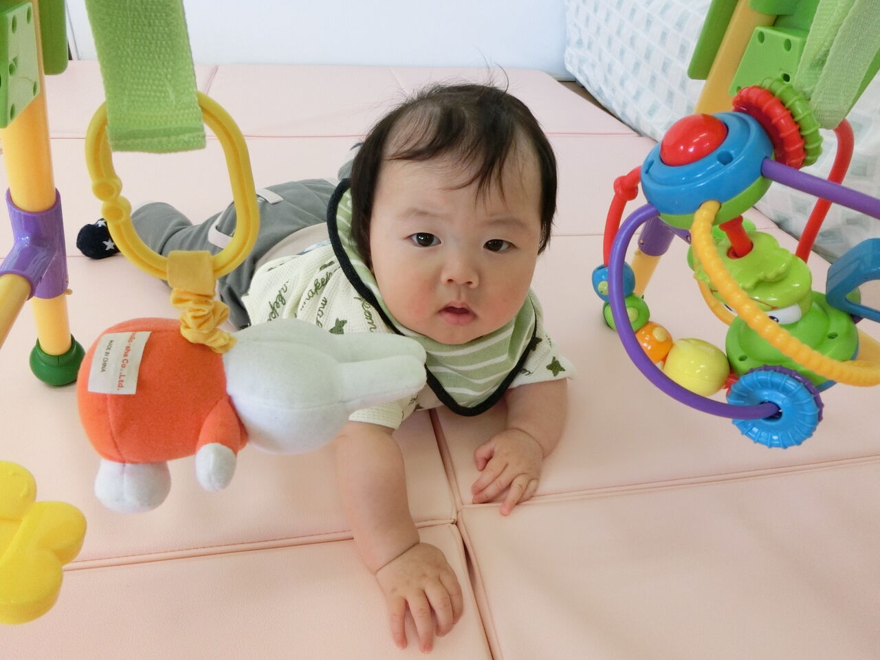 小さなお友だちは寝返りも、うつ伏せからの首を上げて遊ぶのも上手になりました