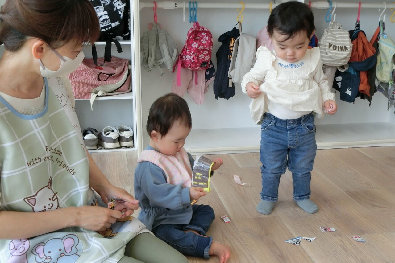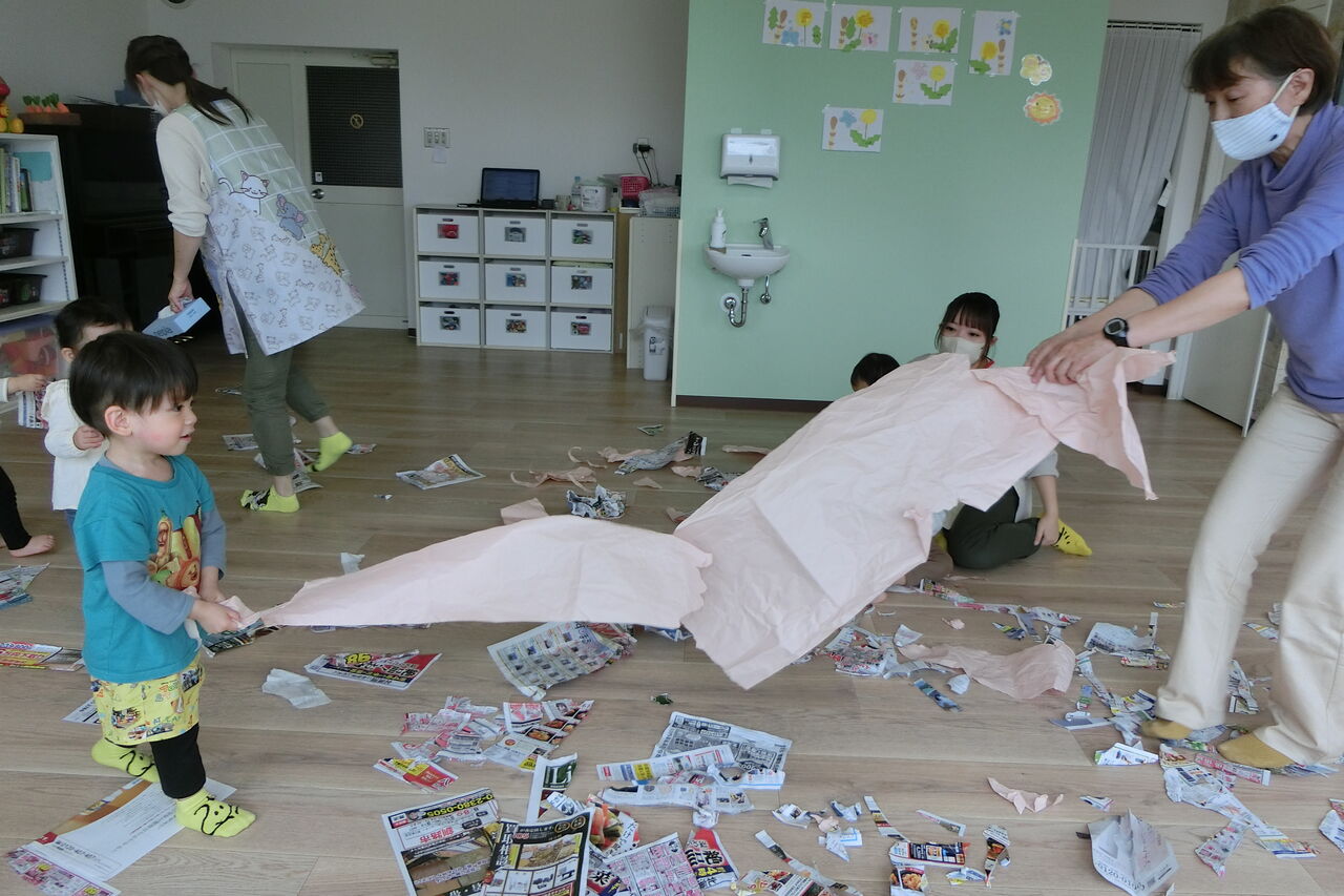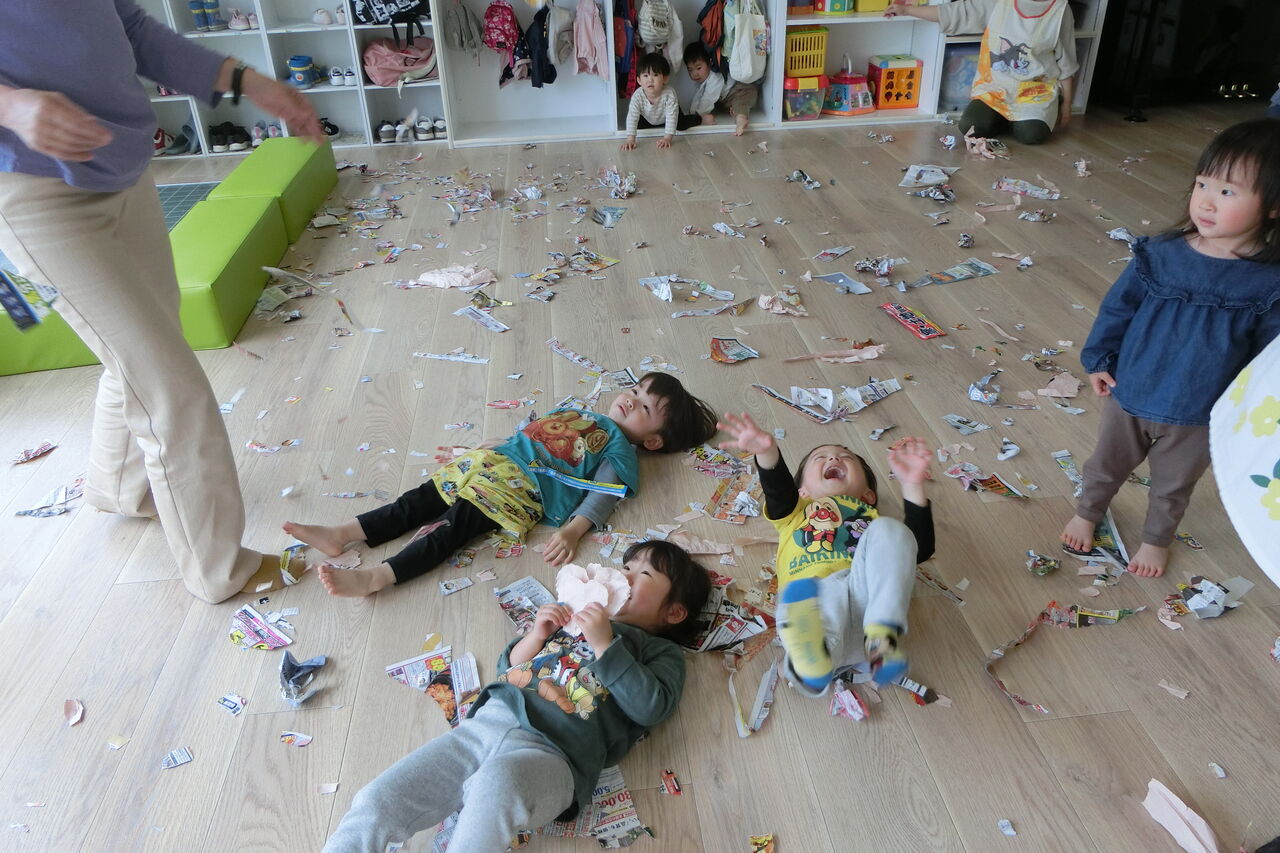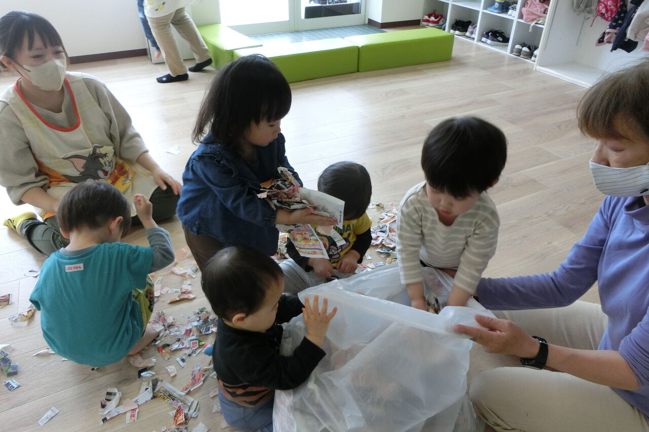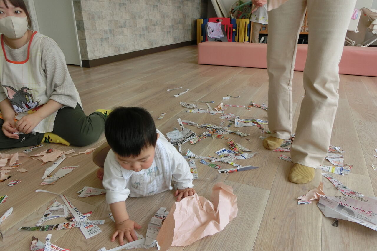 今日はみんなでチラシビリビリあそび。